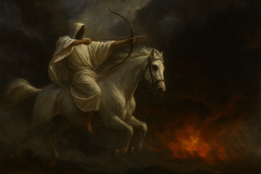 Le premier cavalier dâApocalypse 6.1-2 ne reprĂ©sente pas le Christ, mais lâAntĂ©christ, qui imite les symboles du Messie pour tromper. MontĂ© sur un cheval blanc et couronnĂ© dâun pouvoir temporaire, il avance avec lâapparence de la victoire et de lâautoritĂ©, mais nâest quâune contrefaçon sĂ©duisante.
