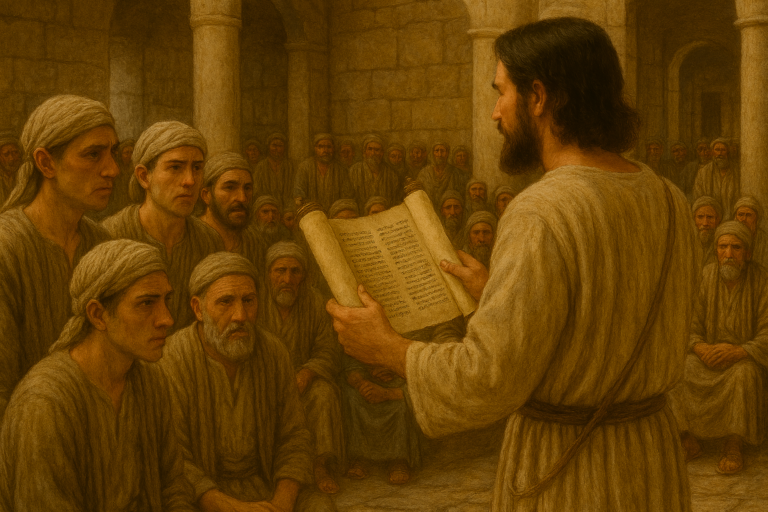 Le Messie Jésus, accompagné de ses disciples, enseigne dans la synagogue de Capernaüm. Ce principe correspond bien aux habitudes de l'époque : les responsables locaux…