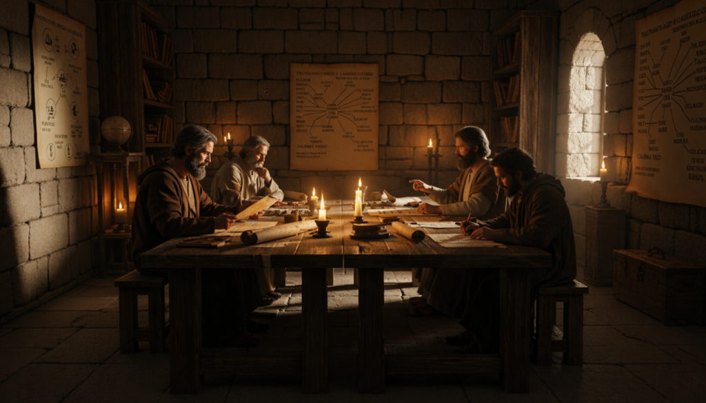 Cette manière de procéder apparaît d’ailleurs explicitement dans la structure même de l’évangile. Matthieu organise sa généalogie en trois séries de quatorze générations ( Matthieu 1.17 ), ce qui montre qu’il adopte un principe de présentation théologique et mnémotechnique plutôt qu’un relevé exhaustif de toutes les générations. L’omission de certains noms ne remet donc pas en cause la véracité du texte ; elle traduit un choix rédactionnel ordonné, fréquent dans les listes généalogiques bibliques ( Esdras 7.1-5 ).