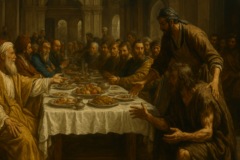 Le Messie JĂ©sus est invitĂ© Ă un repas chez un chef des pharisiens un jour de sabbat (Luc 14.1). Il observe les comportements des invitĂ©s et enseigne sur lâhumilitĂ© et le choix des places (Luc 14.7â11). Puis il exhorte son hĂŽte Ă inviter les pauvres plutĂŽt que les riches (Luc 14.12â14).