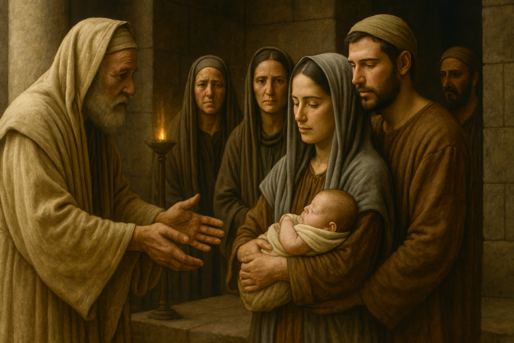 Lors de leur visite, ils font une rencontre des plus surprenantes. Un homme du nom de Siméon, qui connaissait bien les prophéties et était convaincu qu’il ne mourrait pas avant d’avoir vu le Messie, est présent dans le temple. Lorsqu’il croise Joseph, Marie et Jésus, Siméon réalise que le Messie annoncé est devant lui et en éprouve une grande joie.