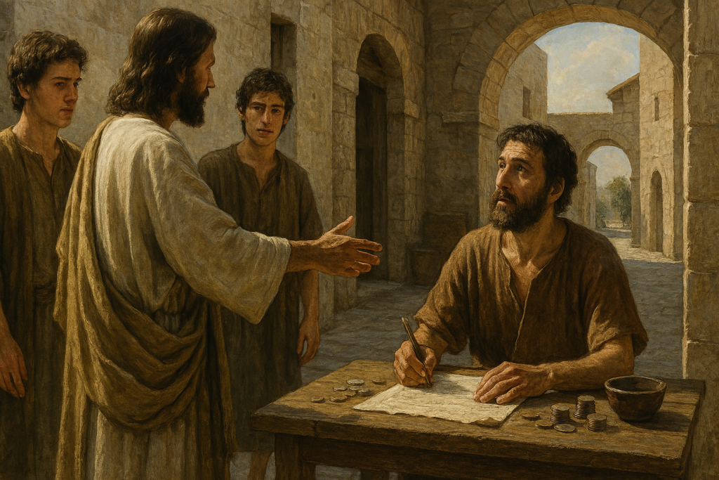 Matthieu se verra confier par ses compagnons la tâche de rédiger leur témoignage après la mort du Maître. Il est à noter que Marc et Luc le nomment Lévi, tandis que l’auteur du premier Évangile semble préférer son nom de Matthieu.