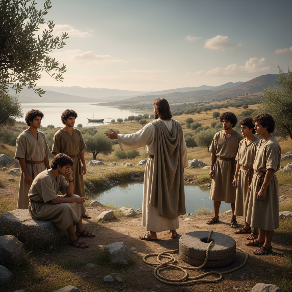 - Luc et Matthieu évoquent la pierre de meule comme une punition pour ceux qui causent la chute des autres.