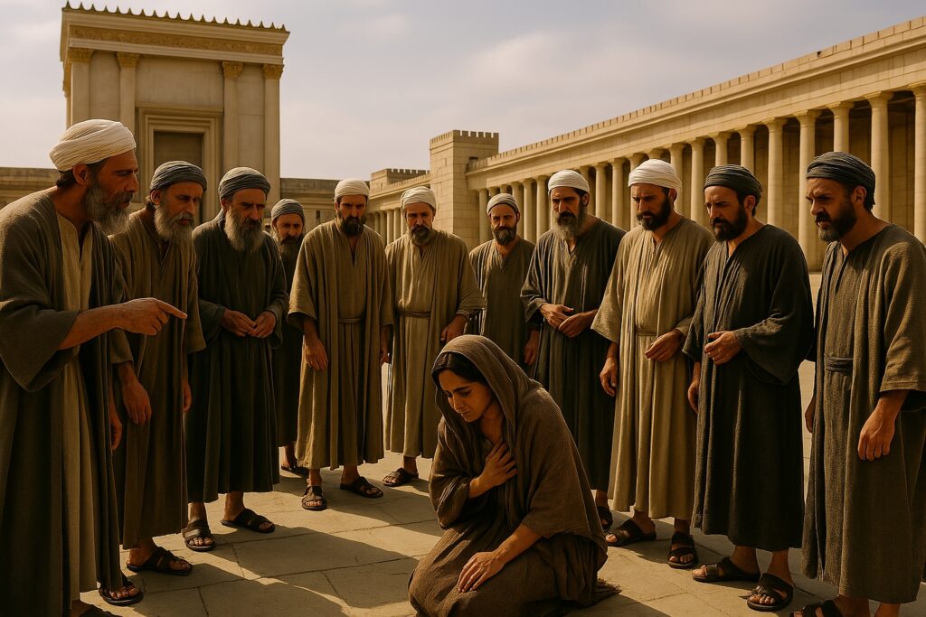 La réponse de Jésus, « Que celui d’entre vous qui est sans péché jette le premier la pierre contre elle », entraîne le retrait des accusateurs. Jésus ne remet pas en cause la Loi mais en éclaire l’esprit, soulignant que la justice divine est indissociable de la miséricorde. Il reconnaît la faute mais recentre le débat en invitant chacun à s’interroger sur ses propres imperfections avant de juger autrui. Enfin, il demande à la femme de ne plus commettre de faute et la laisse repartir librement.