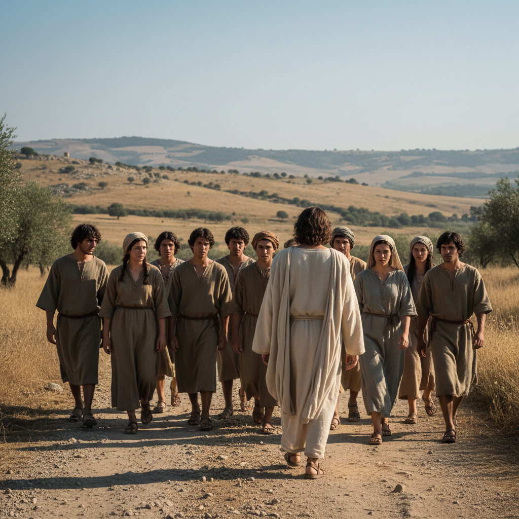 Autour d’eux, la route vers Jérusalem continue, et Jésus reprend sa marche. Il avance avec une paix étrange, une force intérieure que les autres ne comprennent pas encore. Il sait ce qui l’attend, mais il ne recule pas. Les disciples, eux, suivent sans comprendre, partagés entre la peur, la fidélité et l’incapacité à mesurer ce qui est en train de s’accomplir sous leurs yeux.