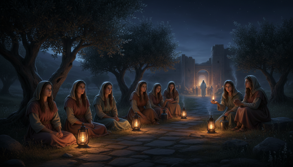 La parabole des dix vierges met en lumière la nécessité d’être prêt pour le retour du Seigneur. Cinq d’entre elles sont qualifiées de sages, car elles ont prévu de l’huile en réserve — symbole d’une vie spirituelle vivante et entretenue. Les cinq autres, qualifiées d’insensées, n’ont rien anticipé pour la durée de l’attente ( Matthieu 25.1-4 ).