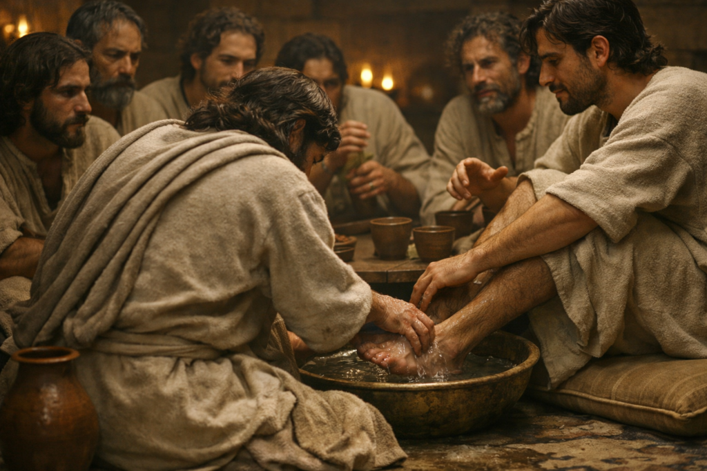 Jean est le seul évangéliste à rapporter ce geste étonnant et profondément symbolique. Le Fils de Dieu, après avoir déposé son manteau, se ceint d’un linge et lave les pieds de ses disciples ( Jean 13.4-5 ). Cet acte, habituellement réservé aux esclaves ou, dans les foyers modestes, accompli par la femme ou les enfants, révèle une humilité divine qui dépasse toute logique humaine. Jésus, le Maître, s’abaisse volontairement pour servir ceux qu’il aime, donnant ainsi un exemple concret de ce qu’il enseigne :