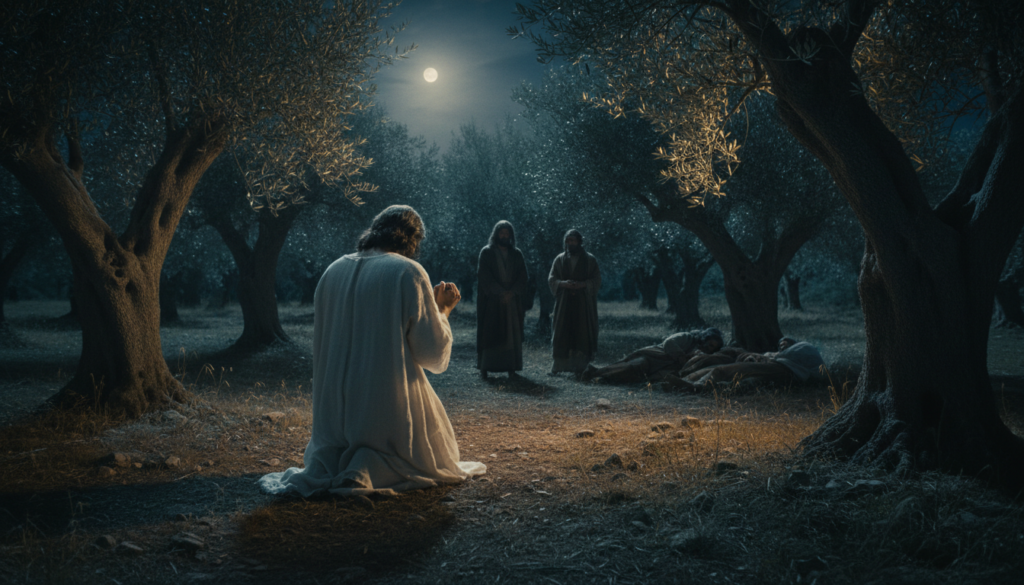 Bien que Fils de Dieu, Jésus manifeste une souffrance humaine intense. Il avoue être « saisi de tristesse et d’angoisse » ( Matthieu 26.38 ) et prie avec instance pour que « cette coupe » (symbole de la souffrance et de la colère divine) s’éloigne de lui ( Marc 14.36 , Luc 22.42 ). Pourtant, il soumet sa volonté à celle du Père : « que ta volonté soit faite » ( Matthieu 26.39 ). Cette prière révèle sa pleine humanité et son obéissance parfaite ( Hébreux 5.7-8 ).