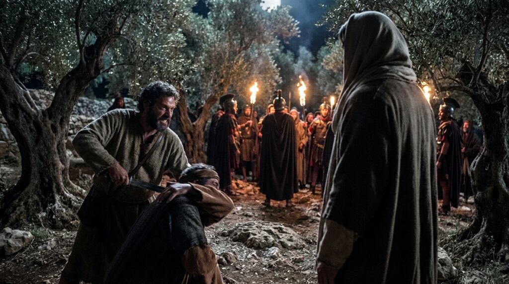 Dans le tumulte de l’arrestation, Simon Pierre ne peut s’empêcher de réagir. Son geste est impulsif, presque instinctif : il tire son épée et frappe le serviteur du grand prêtre, lui tranchant l’oreille droite ( Jean 18.10 ). Le serviteur, nommé Malchus selon Jean, échappe de peu à la mort. Pierre ne plaisante pas : son coup visait probablement la tête, et seul un mouvement de recul a sauvé la vie de cet homme. Les Synoptiques mentionnent l’incident sans nommer Pierre, sans doute pour éviter de lui attirer des ennuis à une époque où les autorités religieuses persécutaient les disciples. Jean, écrivant plus tard, peut citer son nom sans risque, Pierre étant déjà mort au moment de sa rédaction.