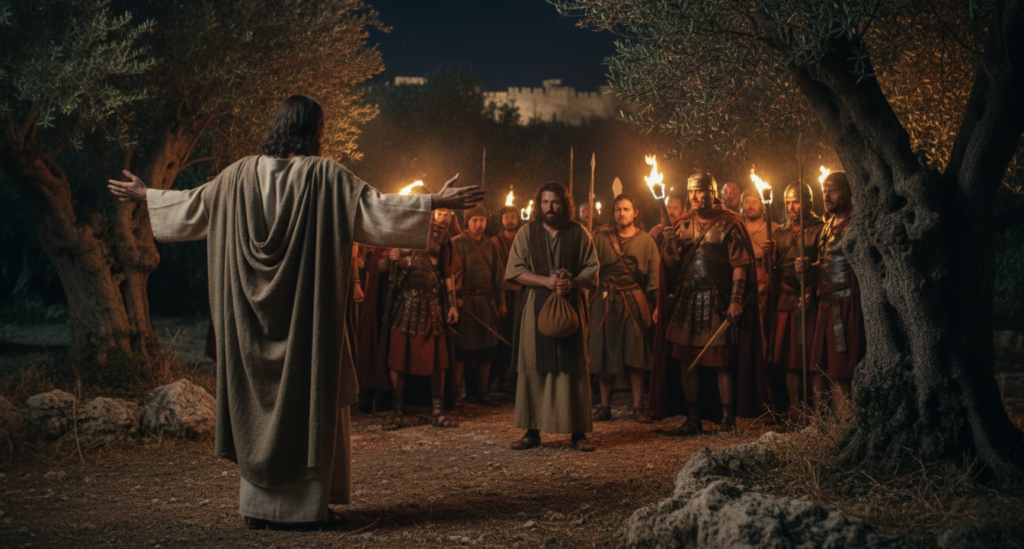 Jésus rappelle que son arrestation n’est pas le fruit du hasard ni la victoire de ses ennemis, mais l’accomplissement du plan divin. Il se livre librement, par amour pour le monde, afin d’accomplir l’œuvre rédemptrice annoncée depuis longtemps ( Jean 3.16-17 ). Sa sérénité, sa maîtrise de lui-même et sa compassion envers ceux qui l’arrêtent témoignent qu’il est véritablement le Fils de Dieu. Là où tout aurait pu dégénérer, il apporte la paix. Là où la violence aurait pu éclater, il impose le calme. Là où les ténèbres semblent dominer, il révèle la lumière de sa mission.
