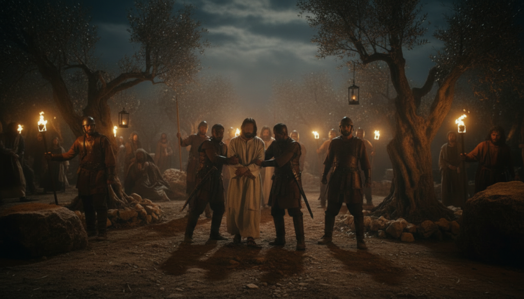 Ce moment met en lumiĂšre un contraste saisissant : d’un cĂŽtĂ©, la peur, la fuite, la confusion des disciples ; de l’autre, la souveraine tranquillitĂ© du Messie JĂ©sus, qui se livre volontairement pour accomplir les Ecritures et rĂ©aliser l’Ɠuvre rĂ©demptrice voulue par le PĂšre ( Jean 3.16-17 ). Alors que les soldats cherchent Ă  imposer leur autoritĂ© par la force, JĂ©sus manifeste une autoritĂ© d’un autre ordre, fondĂ©e sur l’obĂ©issance, la paix et l’amour. Les disciples s’enfuiront, mais ils reviendront transformĂ©s aprĂšs la rĂ©surrection, lorsque la lumiĂšre du plan divin dissipera enfin leurs peurs.