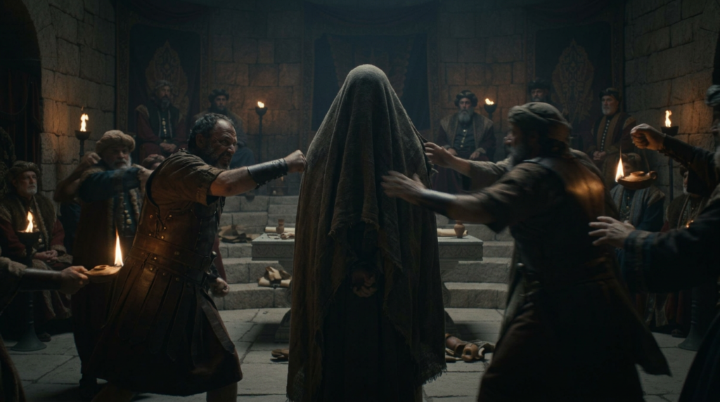 Après la décision de Caïphe, les maltraitances contre le Messie Jésus commencent. Ce ne sont pas des soldats romains qui le brutalisent, mais très probablement les membres de la garde du Temple, des hommes placés sous l’autorité directe du Sanhédrin. Leur rôle était d’assurer l’ordre dans l’enceinte sacrée, mais ici ils deviennent les instruments de l’humiliation. On ne peut pas encore parler de torture au sens strict, mais la violence est réelle : coups, moqueries, crachats, insultes. L’humiliation est terrible. Pourtant, cette attitude ne reflète pas celle de l’ensemble de la population juive ; nous sommes face à des hommes entièrement dévoués aux autorités religieuses, prêts à exécuter leurs ordres sans scrupule.